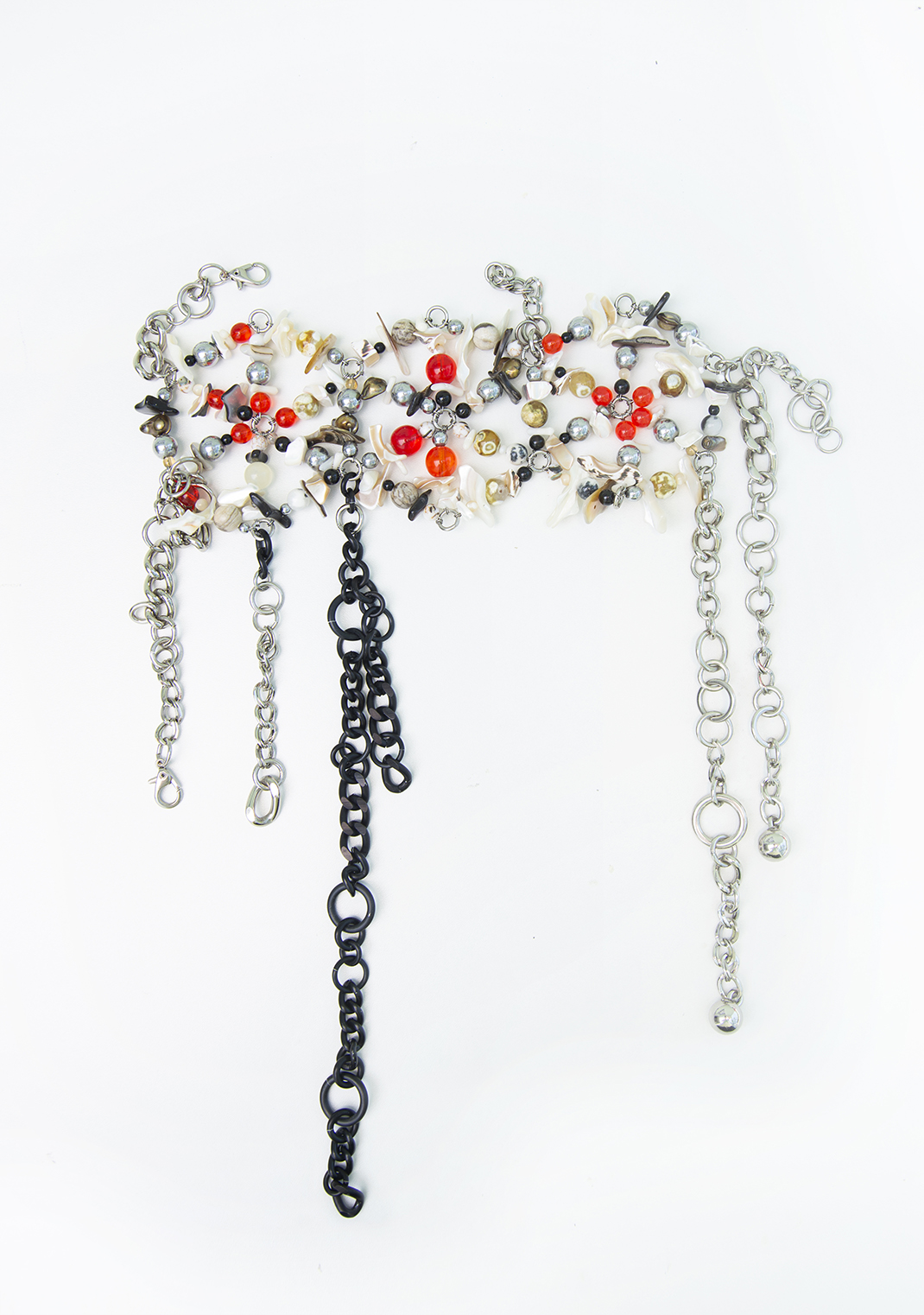 Material: Pedras naturais, pérolas, madrepérolas, vidro, alumínio e aço niquelado envernizado.