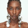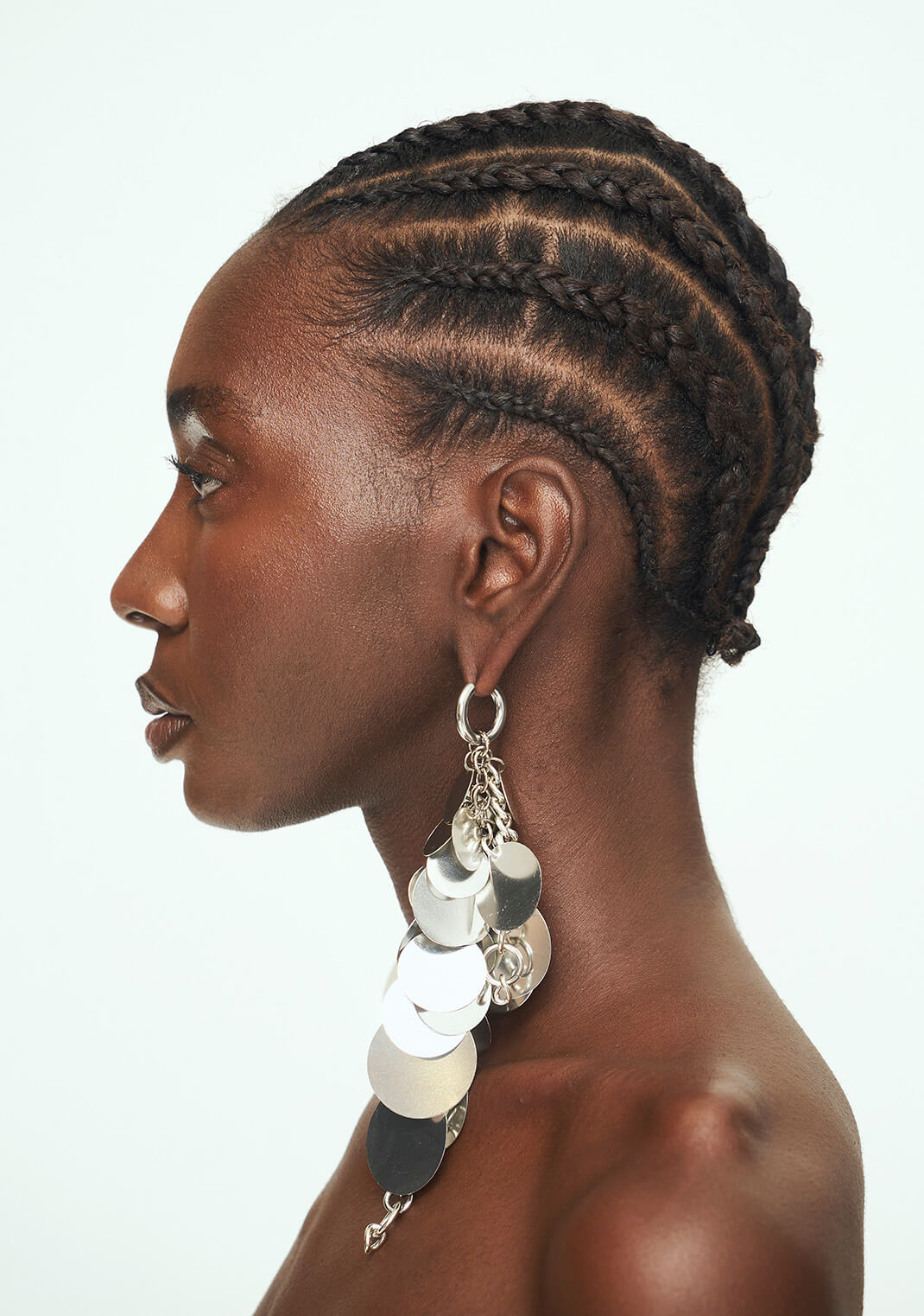 Brinco de corrente e discos de alumínio prateado brilhante.