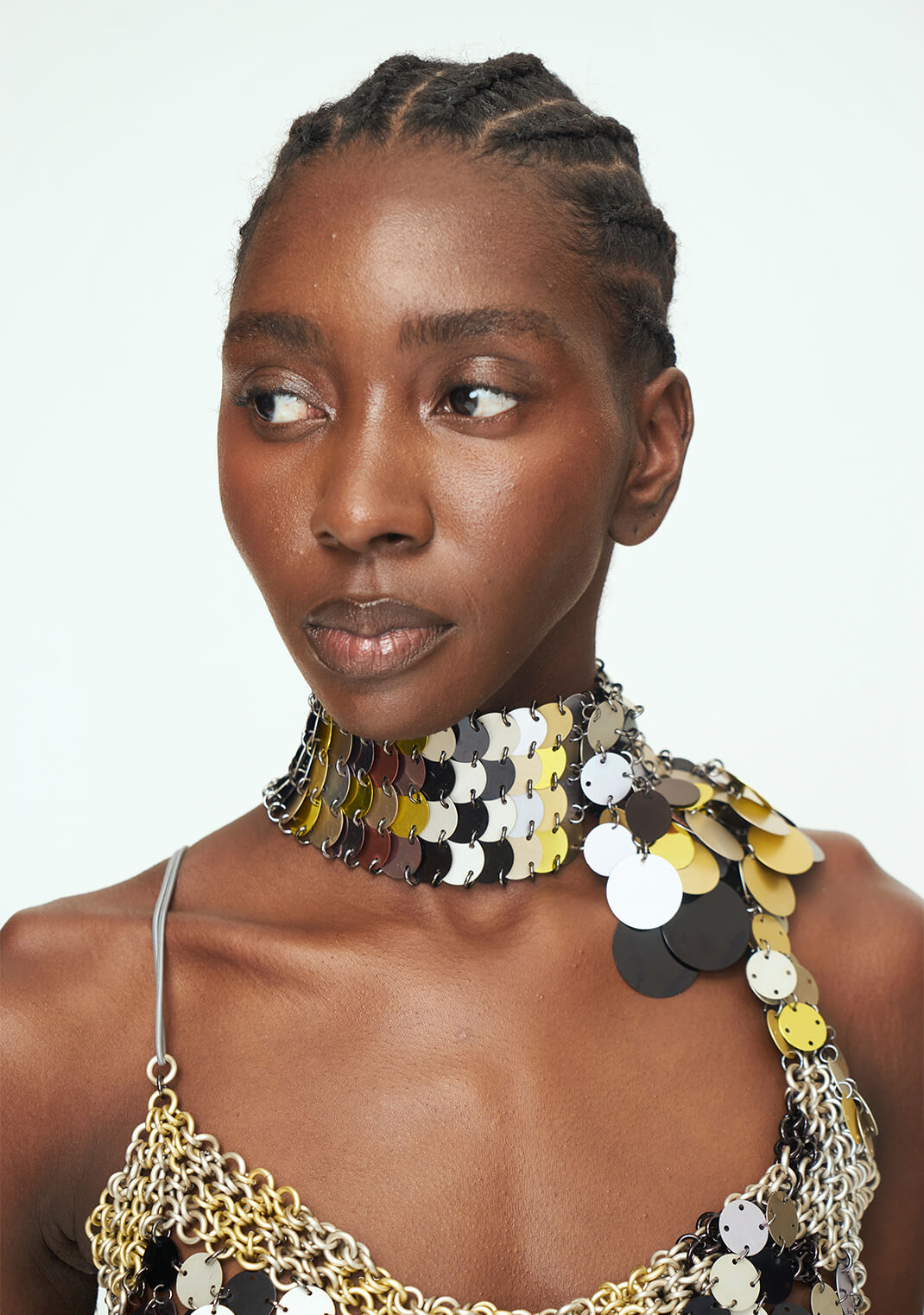Choker em discos de alumínio multicolorido brilhante e fosco.