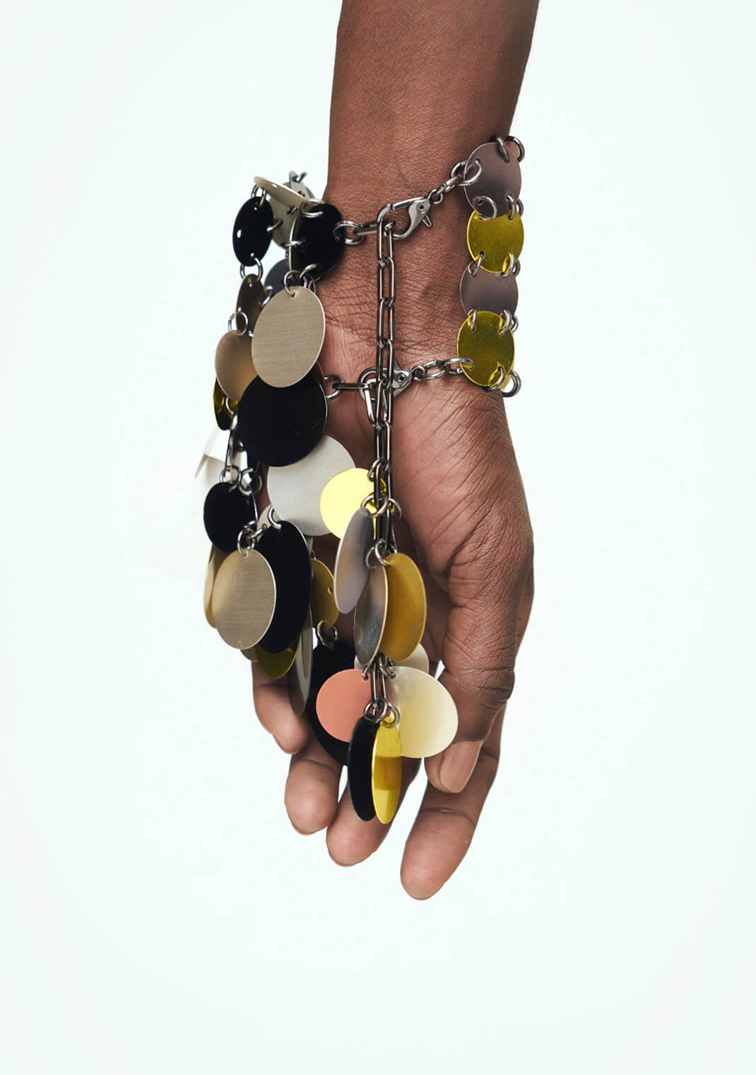 Pulseira em discos de alumínio multicolorido brilhante e fosco. Preço por unidade.