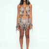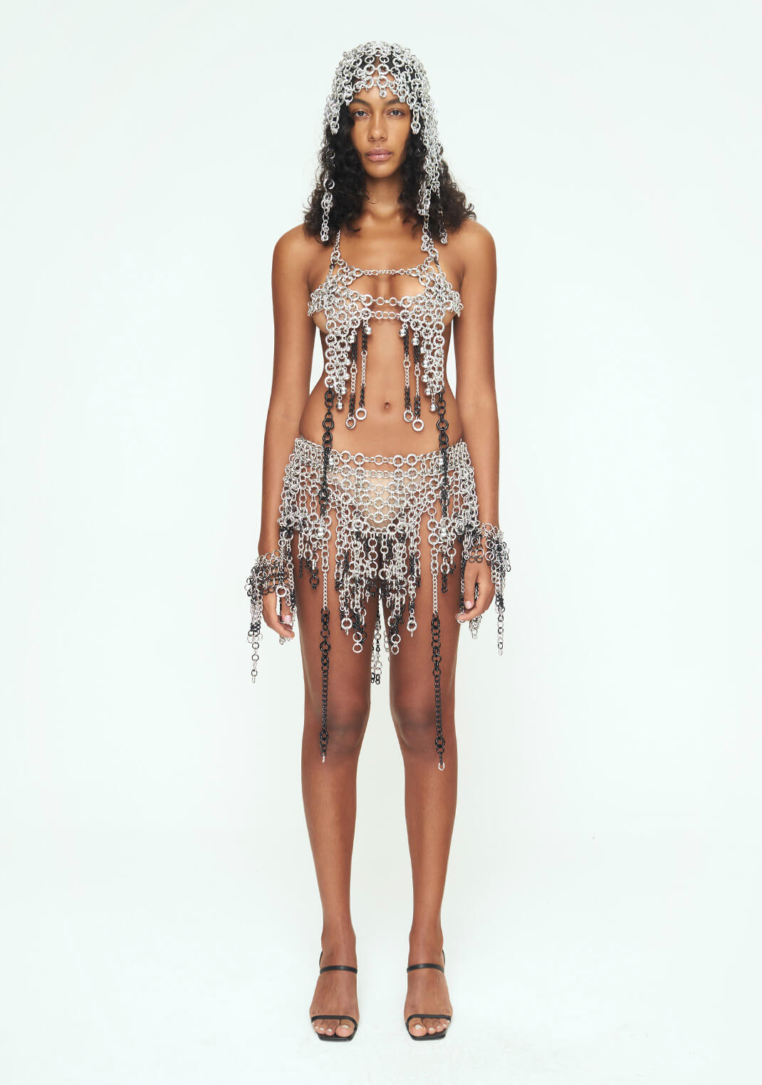 Saia em argolas com franjas de argolas e correntes de alumínio prateado e preto brilhante.